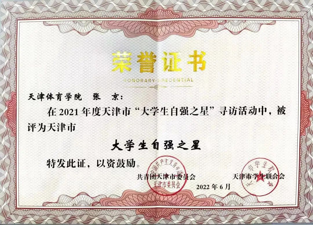 运动训练科学学院2021级硕士研究生张京,体育文化学院2018级本科生李雪娜获得2021年度天津市“大学生自强之星”荣誉称号。