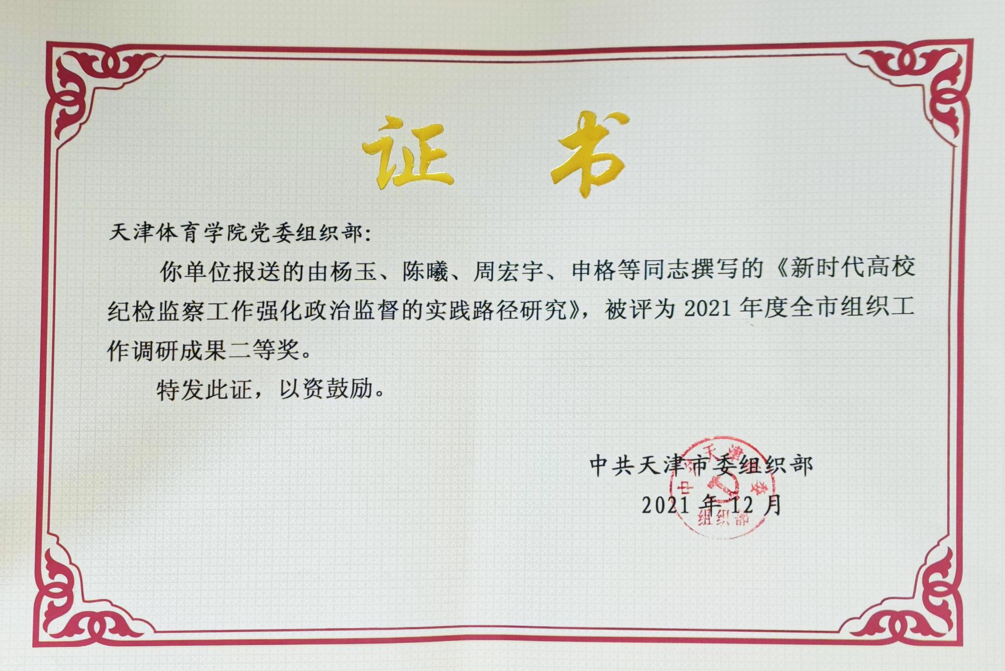 日前,市委组织部公布2021年度全市组织工作课题调研成果获奖情况,情色视频 社会体育与健康科学学院党委副书记、纪委书记杨玉同志作为课题负责人上报的《新时代高校纪检监察工作强化政治监督的实践路径研究》,荣获天津市2021年度组织工作调研成果二等奖。
