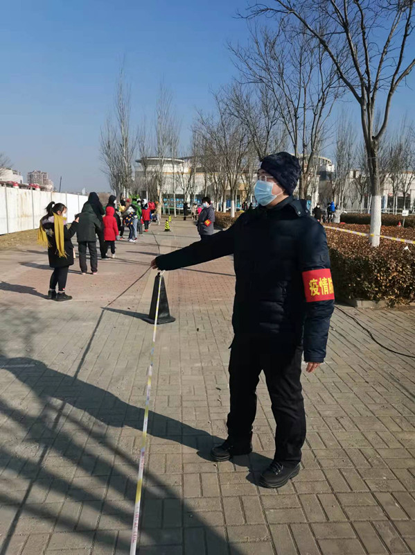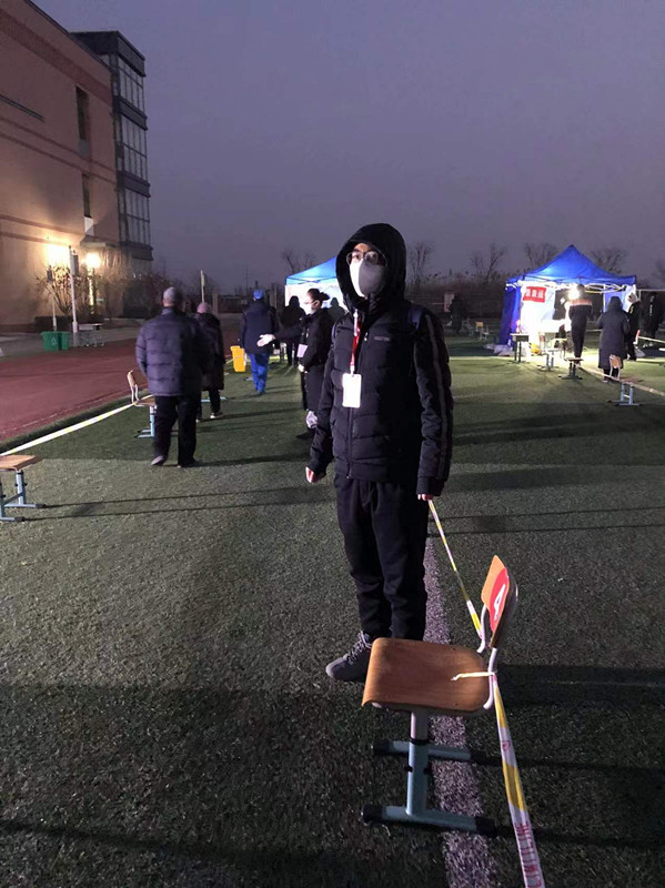 郑义,运动与健康研究院教师,参加静海区华康街道核酸筛查志愿服务,参与完成现场秩序维护。