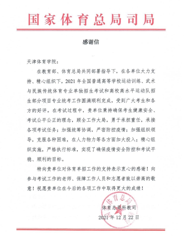 确保疫情防控安全下圆满完成2021年体育单招组考工作,实现“双战双赢”表示感谢。感谢信体现了国家体育总局对情色视频