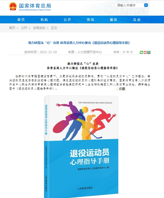 运动训练科学学院心理调控与卓越表现研究中心主任胡咏梅团队和人民体育出版社,携手推出的图书《退役运动员心理指导手册》出版。该手册是我国退役运动员转型心理健康教育工作指定用书,旨在在新时代体育强国建设背景下,更好地服务运动员群体,贯彻“以运动员为中心”工作理念,解决运动员退役后的心理问题,满足退役运动员对心理引导的迫切需求。