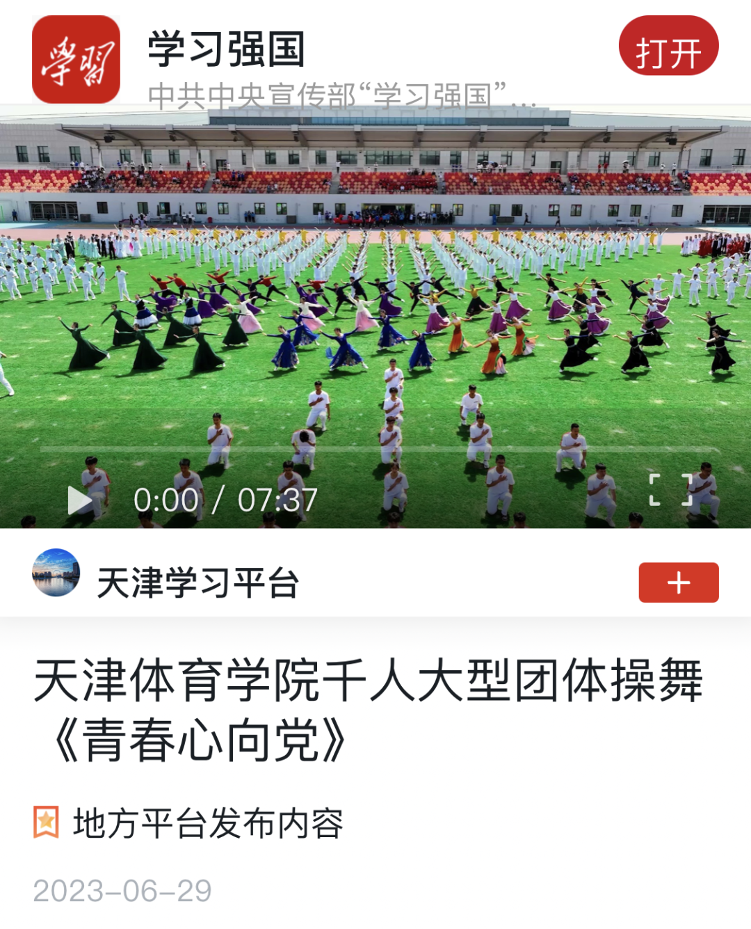 6月29日,学习强国天津学习平台播发情色视频 千人大型团体操舞《青春心向党》。