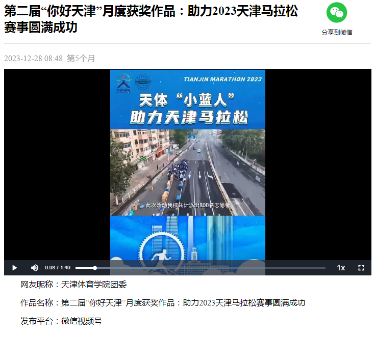 团委微信视频号作品《助力2023天津马拉松赛事圆满成功》入围月度优秀作品。