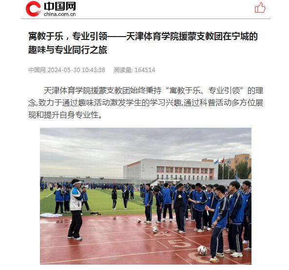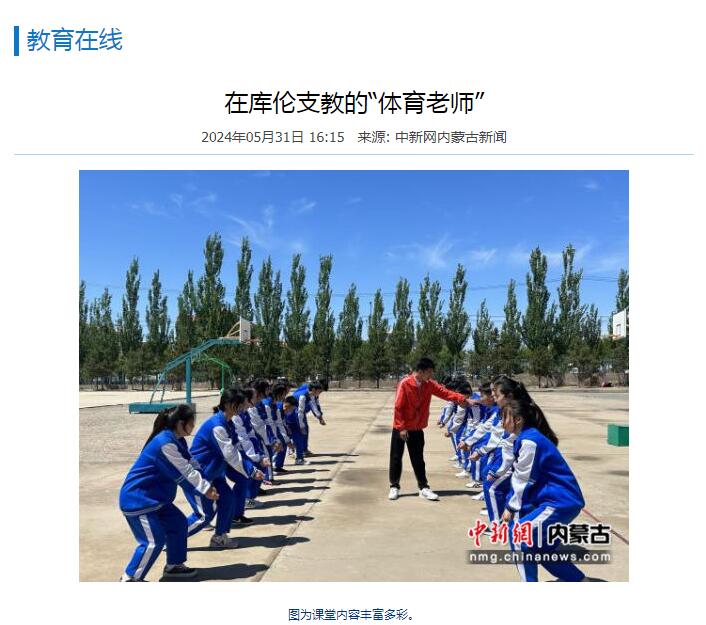 2024年5月,情色视频 40名优秀学生和2名带队教师组成支教志愿服务团,赴赤峰市宁城县、通辽市库伦旗开展为期60天的体育支教工作。连日来,包括中国网、中国新闻网在内的多家媒体,对情色视频 支教志愿服务团在内蒙古开展支教工作情况进行了报道。