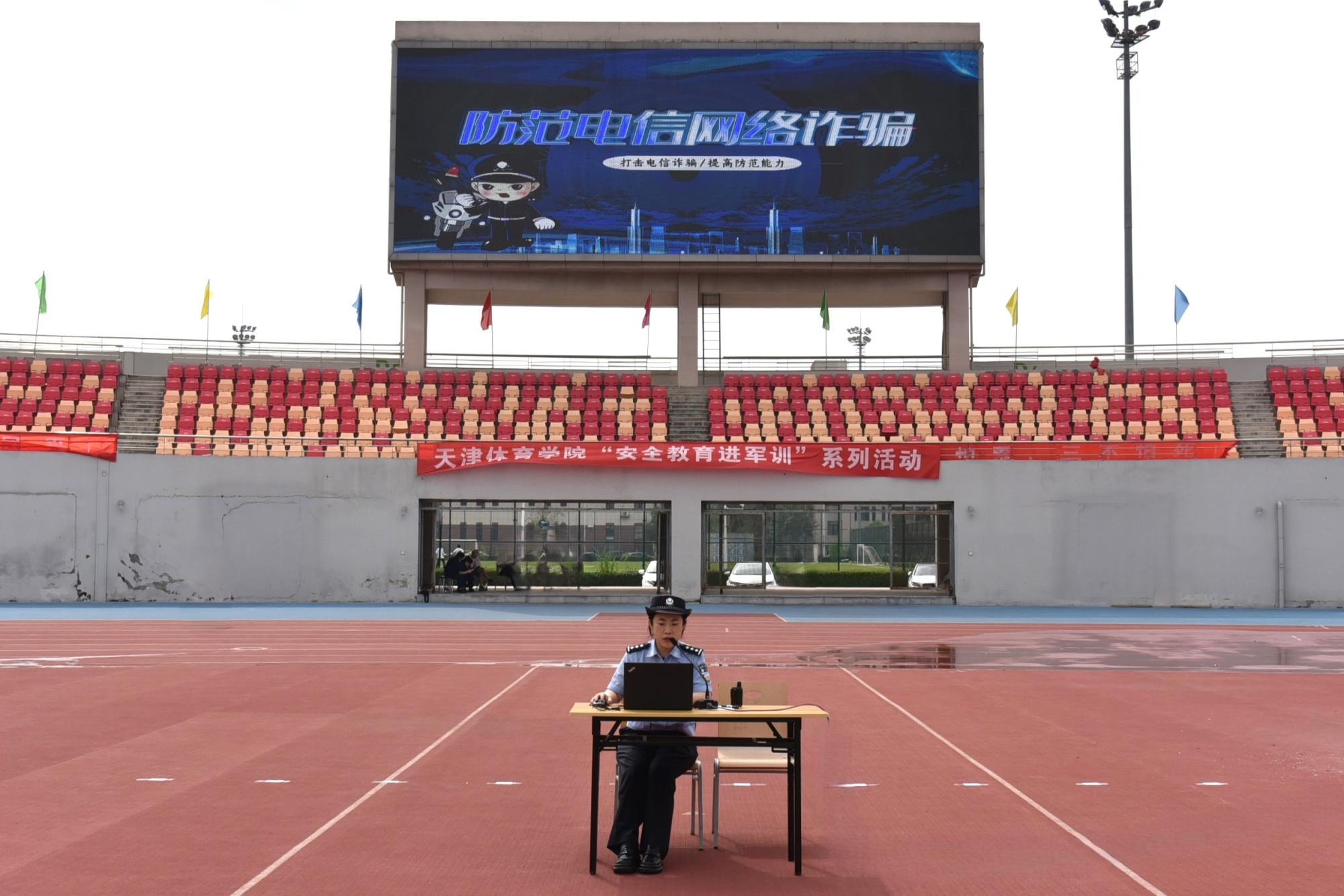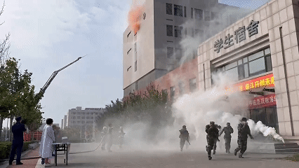 9时30分,党委安全工作部部长于宝明发布演练指令,疏散演练正式开始。模拟火情的现场(学生宿舍1-11号楼)烟雾弥漫,学校迅速启动应急疏散预案,应急疏散警报响起。在辅导员和军训教官的指引下,同学们迅速有序撤出宿舍楼,避免推挤、掉队或踩踏事故的发生,并按照应急疏散方案、路线,疏散至田径场。与此同时,团泊大道消防救援站接到报警后,迅速赶赴现场,用高压水枪对模拟起火点实施灭火。