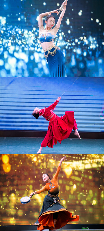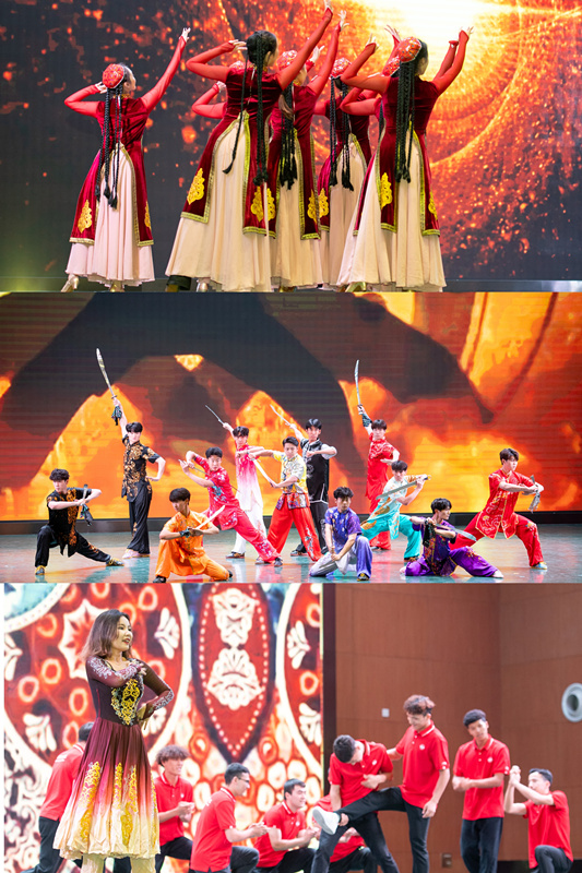 “红石榴”铸牢中华民族共同体意识宣讲团成员姜宏浩、艾日帕尼·艾尼瓦尔与张奕锦同学,结合自身的成长与求学经历,讲述自己作为一颗“石榴籽”在中华民族大家庭这个“红石榴”中的所见所闻所感,展现了各族儿女共同团结奋斗、共同繁荣发展,为强国建设、民族复兴贡献力量的决心。舞蹈《艺舞传承》翩如兰苕翠,宛如游龙举,生动展现了民族舞蹈的继承与发展,《掀起你的盖头来》淋漓尽致地展现了新疆少数民族淳朴热情的精神风貌,武术表演《龙腾虎跃》,剑舞风云动、拳出天地惊,体现了中华民族崇德尚武的文化内核。