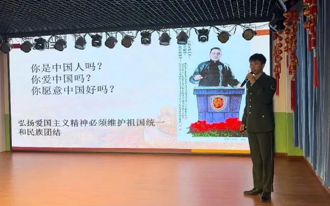 大学生吴英仁以参军入伍的个人经历、英雄人物故事为切入点,结合军事题材的电影及纪录片娓娓道来,引发了在场师生的情感共鸣,让当地中学生在深入理解人民解放军忠诚、奉献精神的同时,激发了他们的爱国之情和报国之志。大学生王子瑜讲述了烈士陈祥榕的英勇事迹、“问勇路”的由来和“帕米尔高原雄鹰”拉齐尼·巴依卡的光辉事迹,并通过“爱国三问”,与现场中学生积极互动。