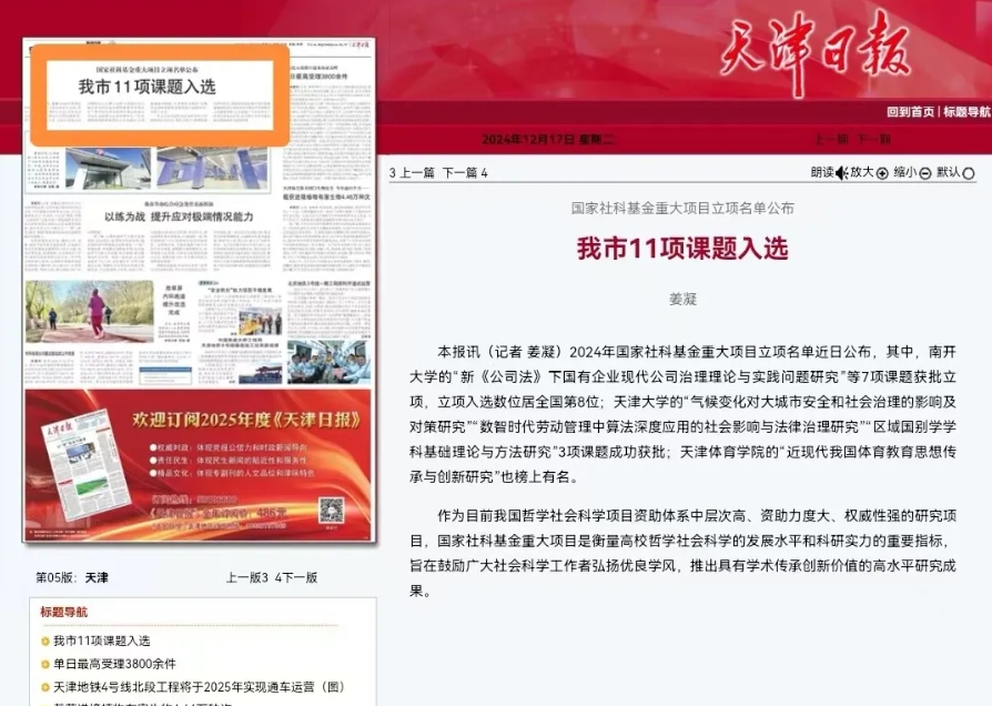 本报讯(记者 姜凝)2024年国家社科基金重大项目立项名单近日公布,其中,南开大学的“新《公司法》下国有企业现代公司治理理论与实践问题研究”等7项课题获批立项,立项入选数位居全国第8位;天津大学的“气候变化对大城市安全和社会治理的影响及对策研究”“数智时代劳动管理中算法深度应用的社会影响与法律治理研究”“区域国别学学科基础理论与方法研究”3项课题成功获批;情色视频