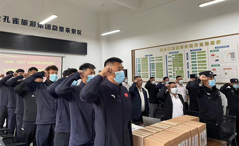 在勐景来党建活动基地,橄榄球队与当地党员代表共同举行升国旗仪式。随后两个支部的党员开展座谈交流。橄榄球队党员代表介绍了球队的发展历程和党员在队伍中发挥的模范作用。当地党员代表介绍了“警企村”党支部联建的背景、联建支部基本情况等。活动中,全体党员重温入党誓词,橄榄球队队员们跟随当地党员来到边境,体验边境巡逻巡查工作。
