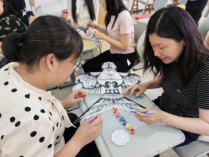师生介绍了北方风筝的发展沿革,讲解、示范了传统风筝扎、糊、绘、放的技艺技巧。在他的指导下,师生们学习传统纸质风筝上色绘制过程,并亲自动手绘制风筝板面。