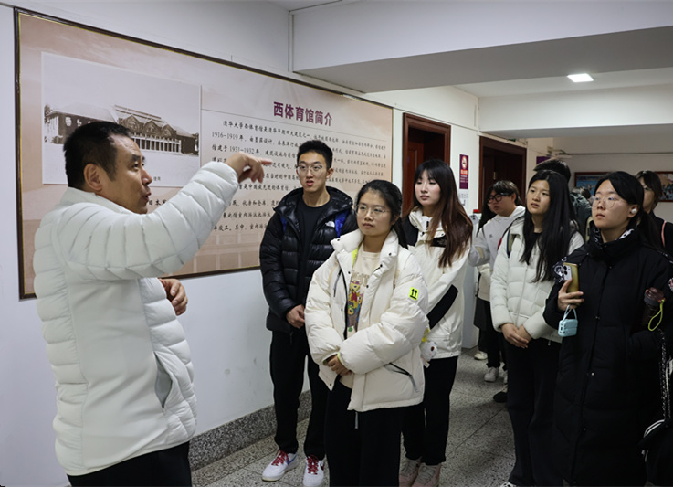 其间,清华大学长聘教授、博士生导师、清华大学体育与健康科学研究中心主任张冰教授带领同学们先后参观了清华大学北体育馆、西体育馆、体育荣誉室。参观过程中,张冰教授为师生们全面讲解了体育馆的设计理念、建设历程,以及在推动体育教育、促进师生健康等方面所发挥的重要作用,详细介绍了马约翰生平和为体育事业所做的贡献。他结合自身科研和服务国家队的经历,以及一代代清华人鲜活的故事,让同学们深刻理解了“为祖国健康工作五十年”“育人至上,体魄与人格并重”“无体育,不清华”的精神内涵。