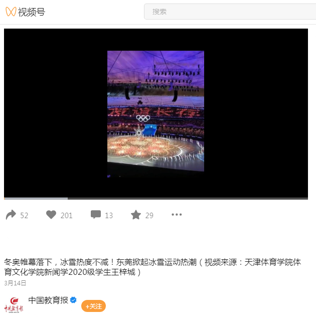 体育文化学院2020级新闻学专业王梓城拍摄的视频《东莞掀起冰雪运动热潮》,在中国教育报官方微信视频号发布。