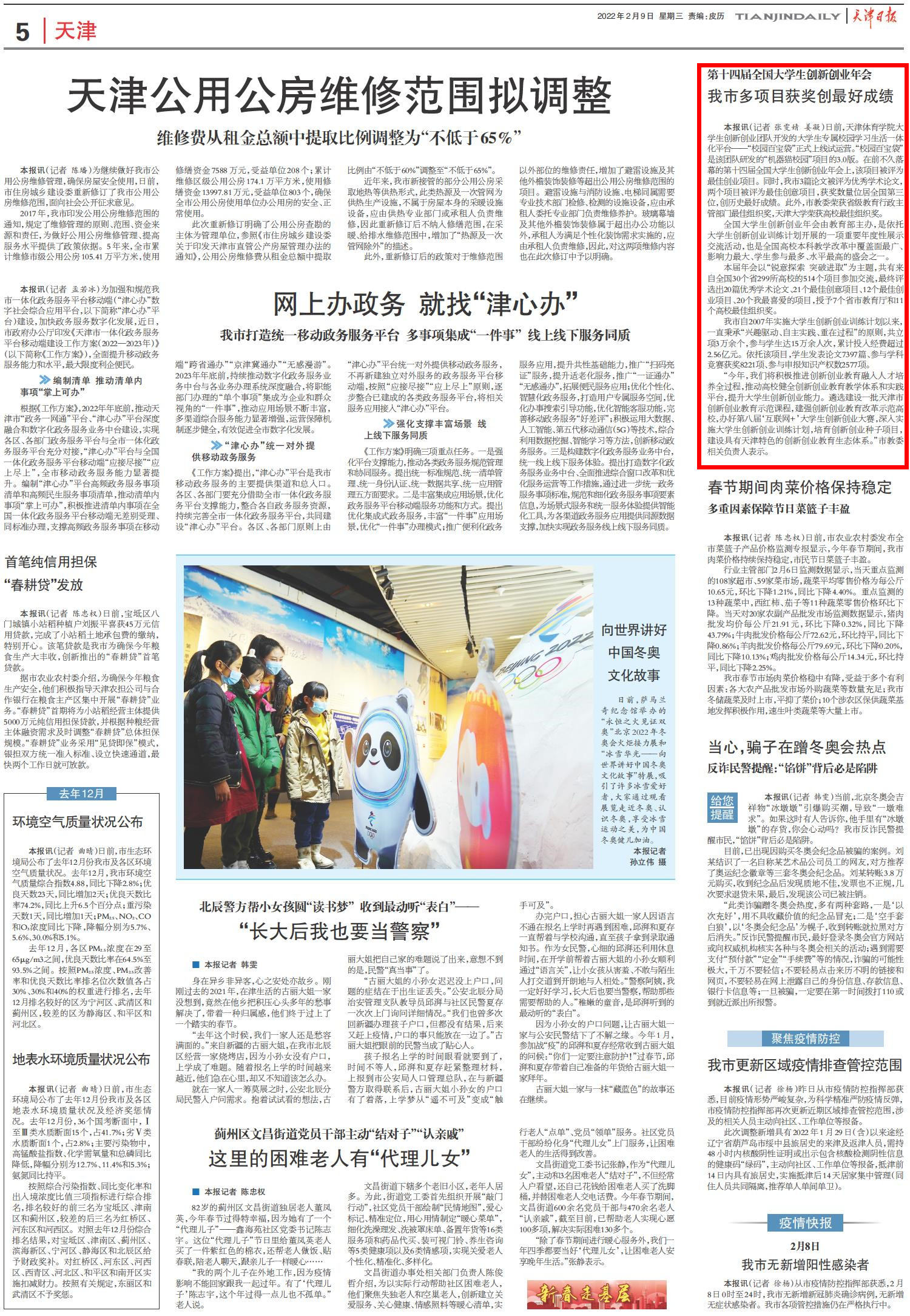 大学生创新创业团队开发的大学生专属校园学习生活一体化平台──“校园百宝袋”正式上线试运营。“校园百宝袋”是该团队研发的“机器猫校园”项目的3.0版。在前不久落幕的第十四届全国大学生创新创业年会上,该项目被评为最佳创业项目。同时,我市3篇论文被评为优秀学术论文,两个项目被评为最佳创意项目,获奖数量位居全国第三位,创历史最好成绩。此外,市教委荣获省级教育行政主管部门最佳组织奖,天津大学荣获高校最佳组织奖。