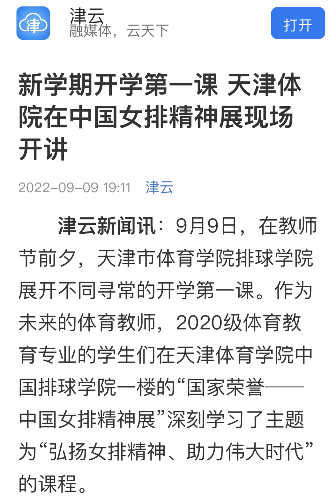 的中国排球学院常设。教师节前夕,我们把开学第一课搬进女排精神展,就是要用更生动、直观的方式,让体育教育专业大学生了解女排故事和新时代体育人的故事,让体育强则中国强的伟大事业薪火相传,希望同学们主动担负起新时代赋予青年的重任,砥砺初心、勇攀高峰,以优异的成绩迎接党的二十大胜利召开!”(津云新闻记者张爱迎 天津日报记者姜凝)