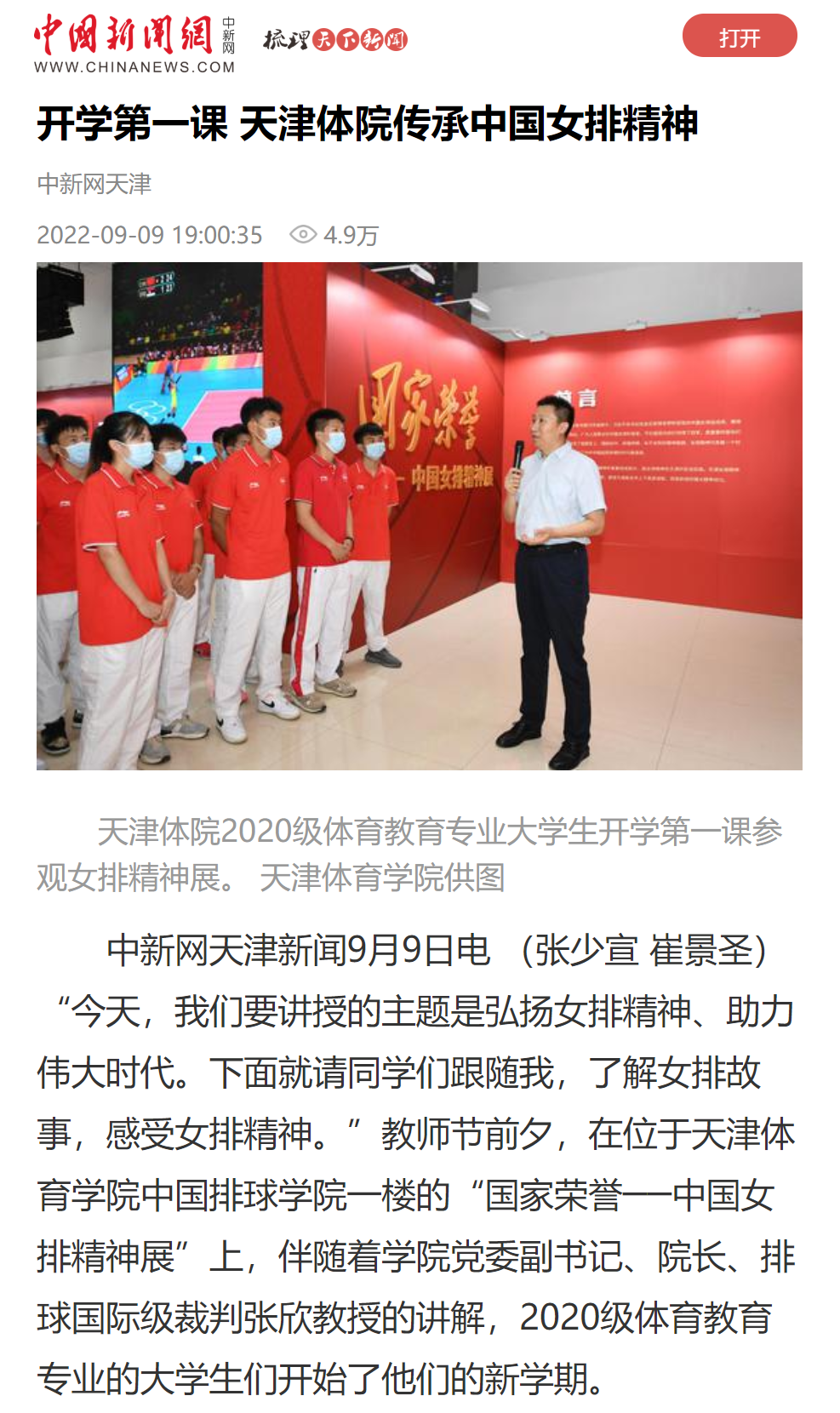 中国排球学院一楼的“国家荣誉──中国女排精神展”,未来的体育教师、2020级体育教育专业的大学生们,聆听了不同寻常的开学第一课。中新网、津云等媒体对此进行了报道。