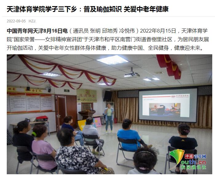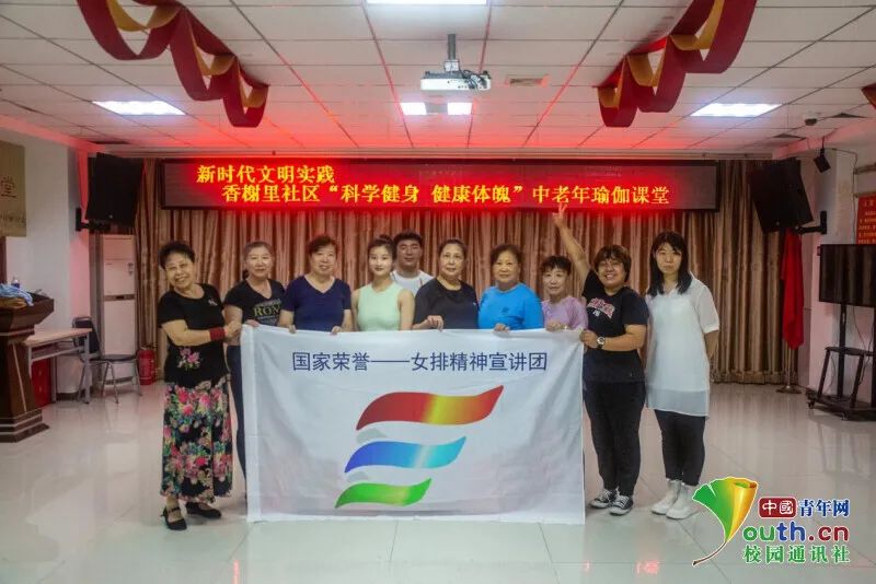 “国家荣誉——女排精神”宣讲团于天津市和平区南营门街道香榭里社区,为居民朋友展开瑜伽活动,关爱中老年女性群体身体健康,助力健康中国、全民健身,健康迎未来。