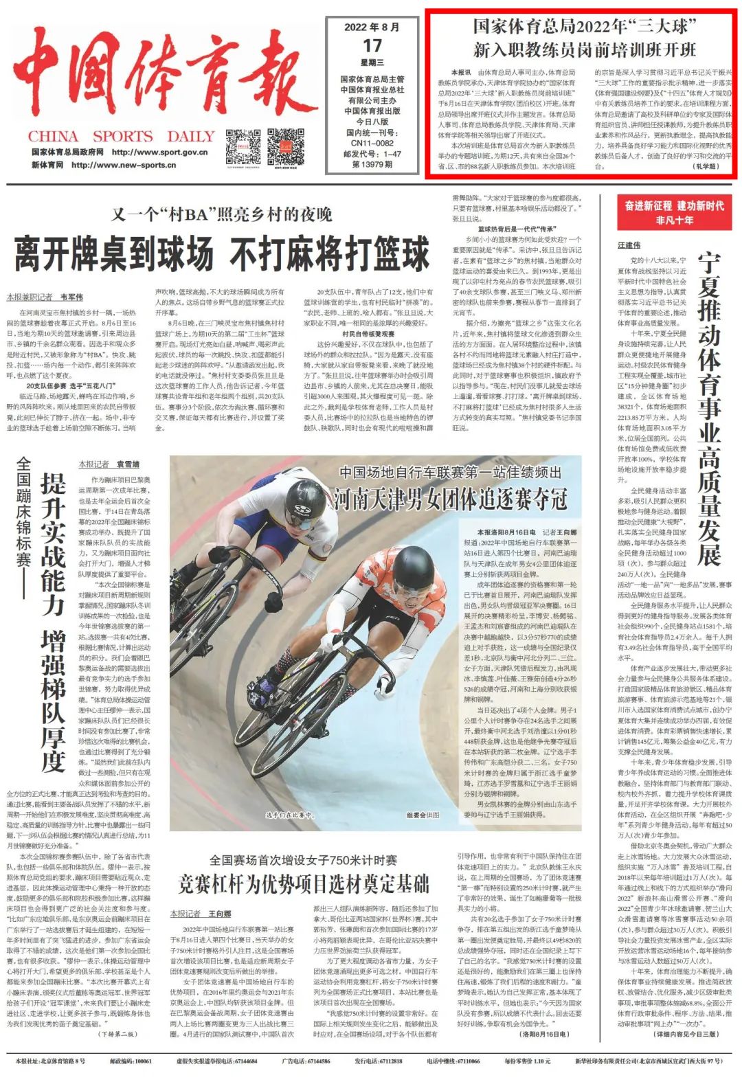 2022年8月17日,《中国体育报》头版报道国家体育总局2022年“三大球”新入职教练员岗前培训班在情色视频