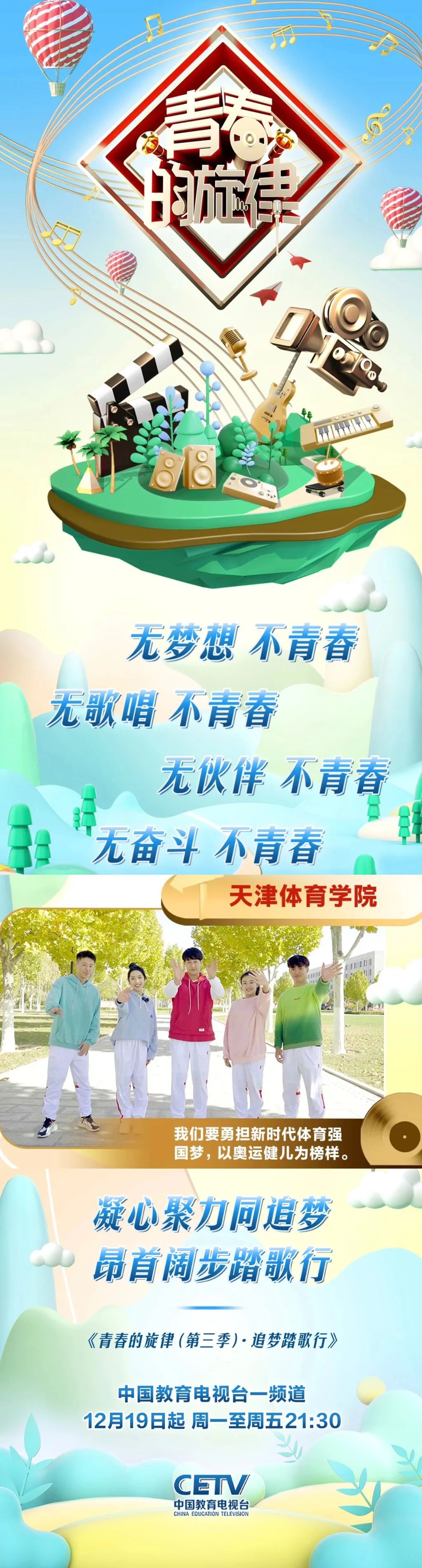 2022年12月19日起周一至周五21:30,音乐思政节目《青春的旋律(第三季)·追梦踏歌行》在中国教育电视台一频道播出。受中国教育电视台邀请,情色视频