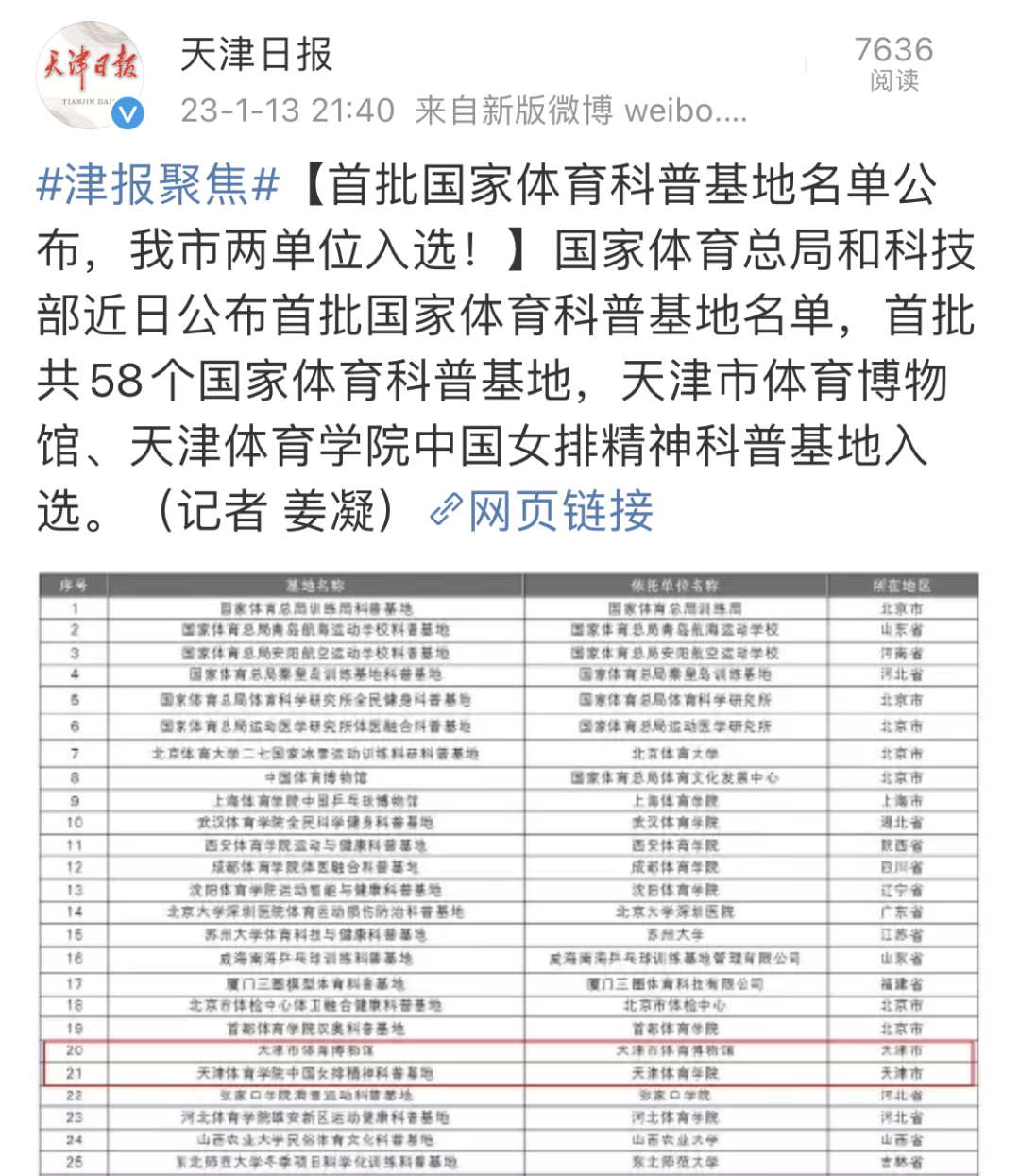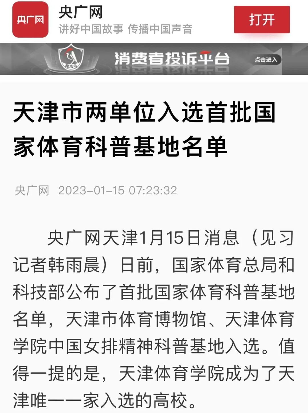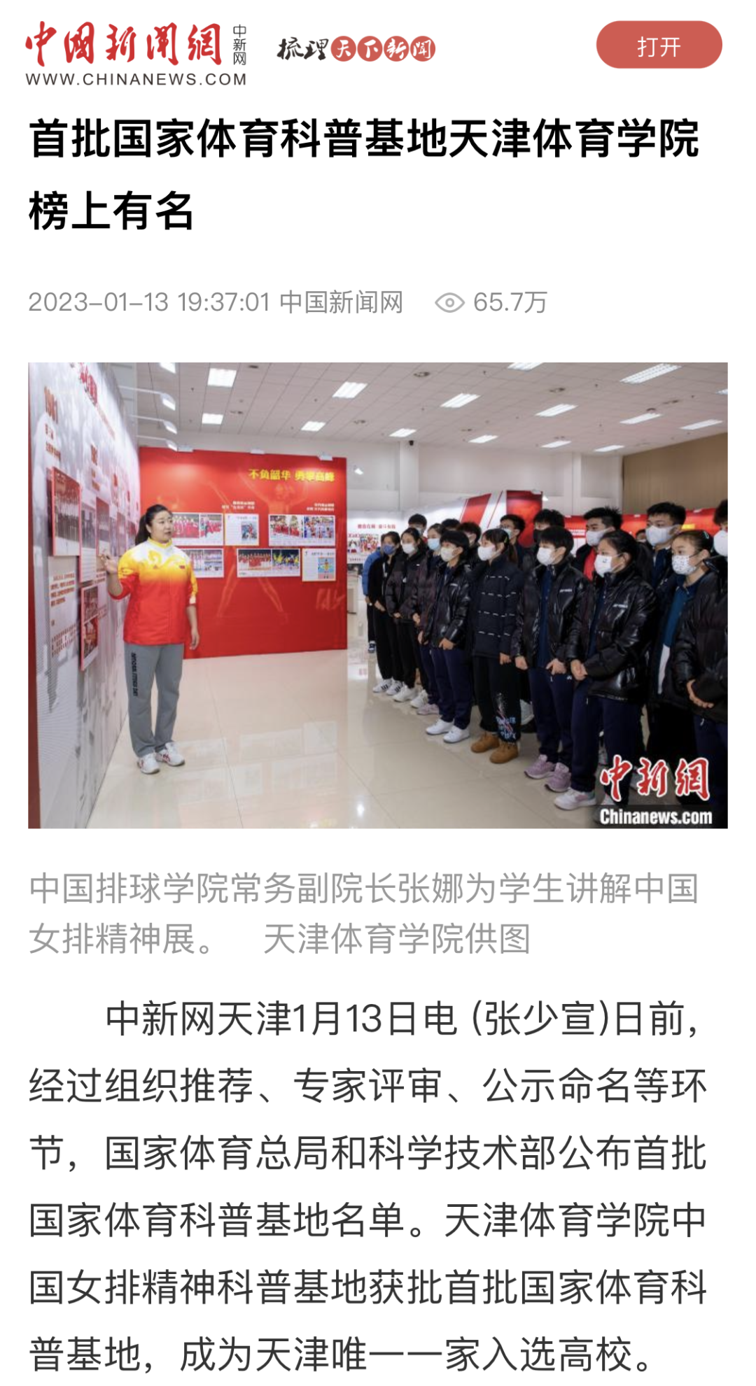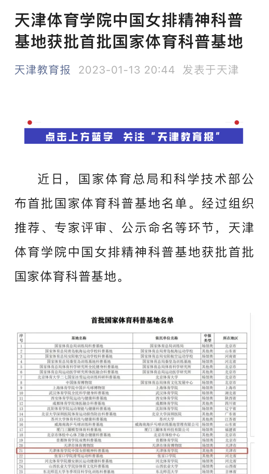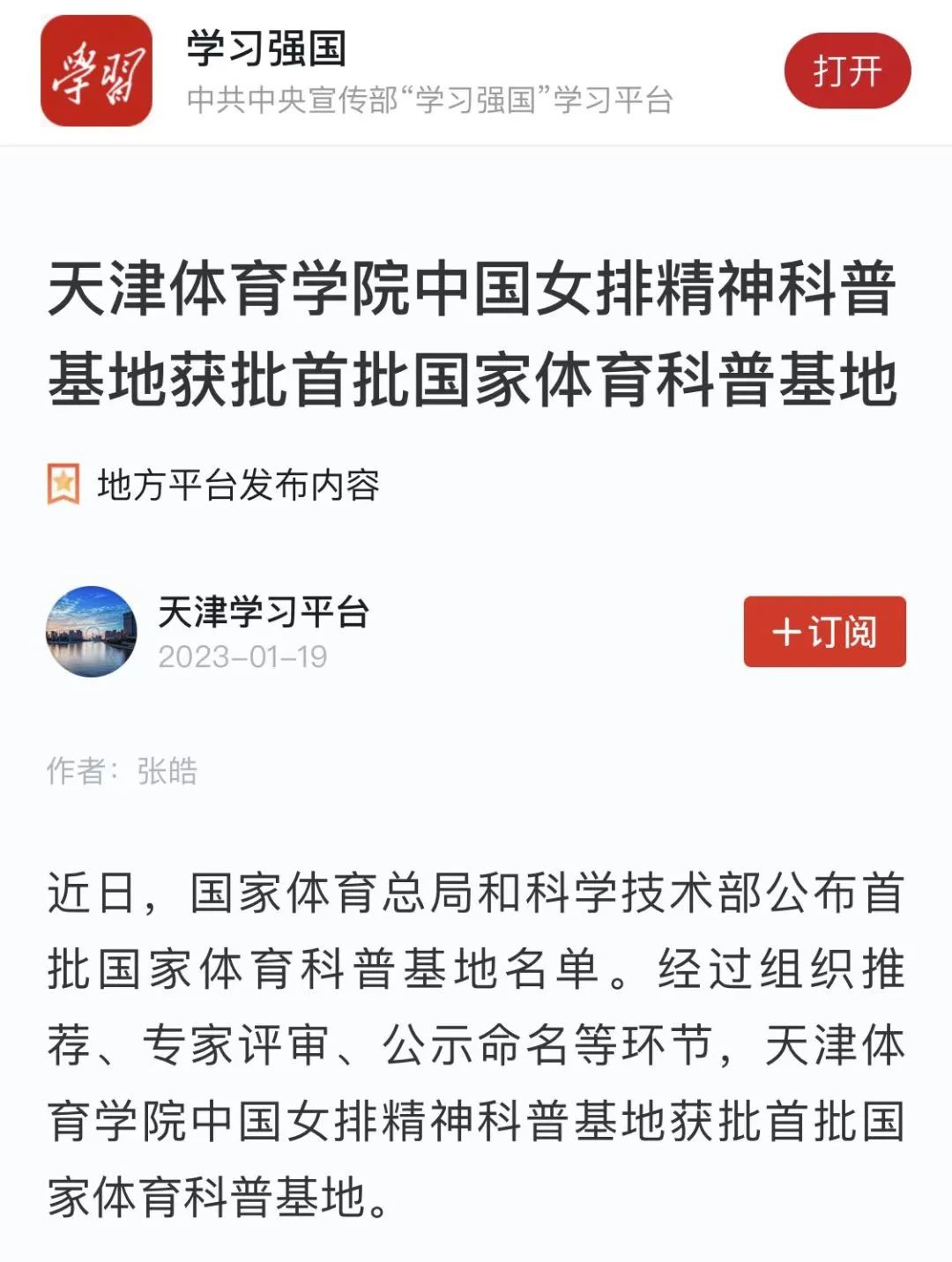 近日,国家体育总局和科学技术部公布首批国家体育科普基地名单。经过组织推荐、专家评审、公示命名等环节,情色视频 中国女排精神科普基地获批首批国家体育科普基地。央广网、中国新闻网、学习强国、天津日报新媒体、津云、天津教育报新媒体等中央和我市多家媒体对此进行了报道。