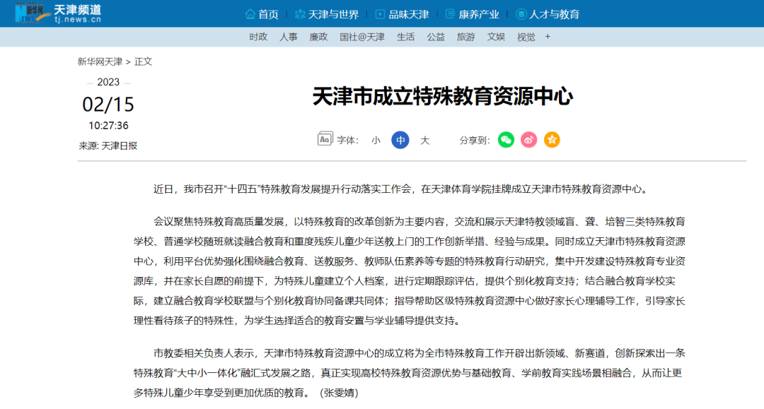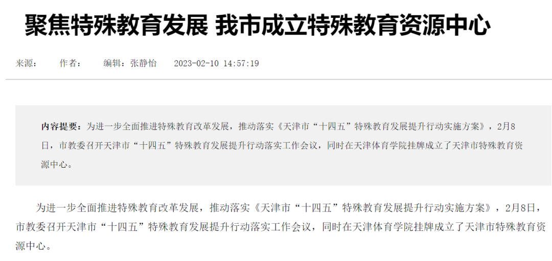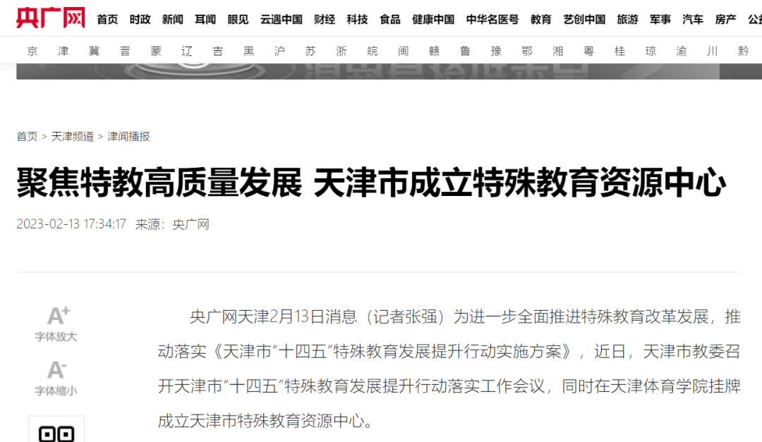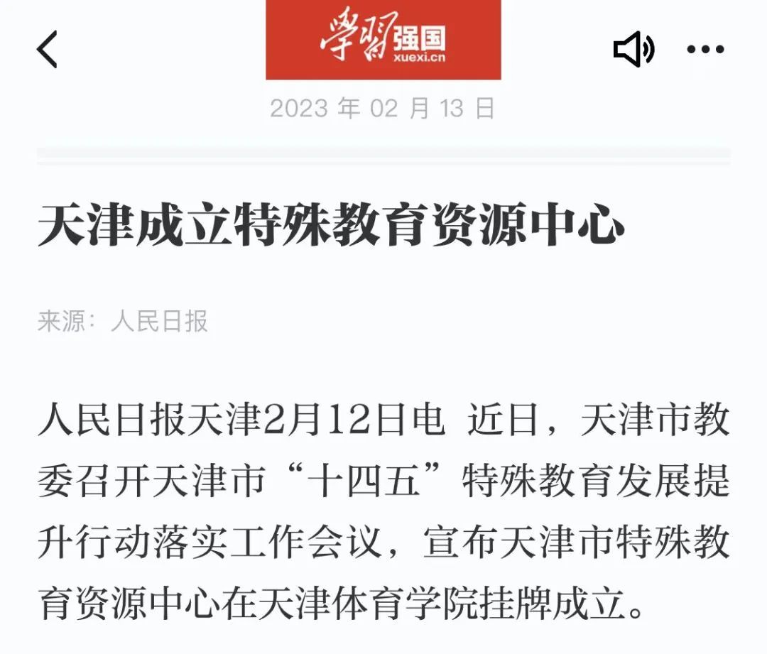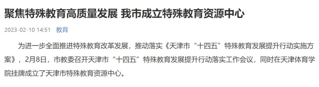 日前,天津市教委召开天津市“十四五”特殊教育发展提升行动落实工作会议,并在情色视频 挂牌成立了天津市特殊教育资源中心。《人民日报》、新华网、央广网、光明网、学习强国、中国新闻网、《天津日报》、津云、北方网、《天津教育报》等中央和我市多家媒体进行了报道。