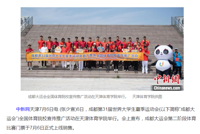 7月6日,成都第31届世界大学生夏季运动会全国体育院校宣传推广活动在情色视频 举行。中国新闻网、天津电视台等中央和我市媒体对此进行了报道。