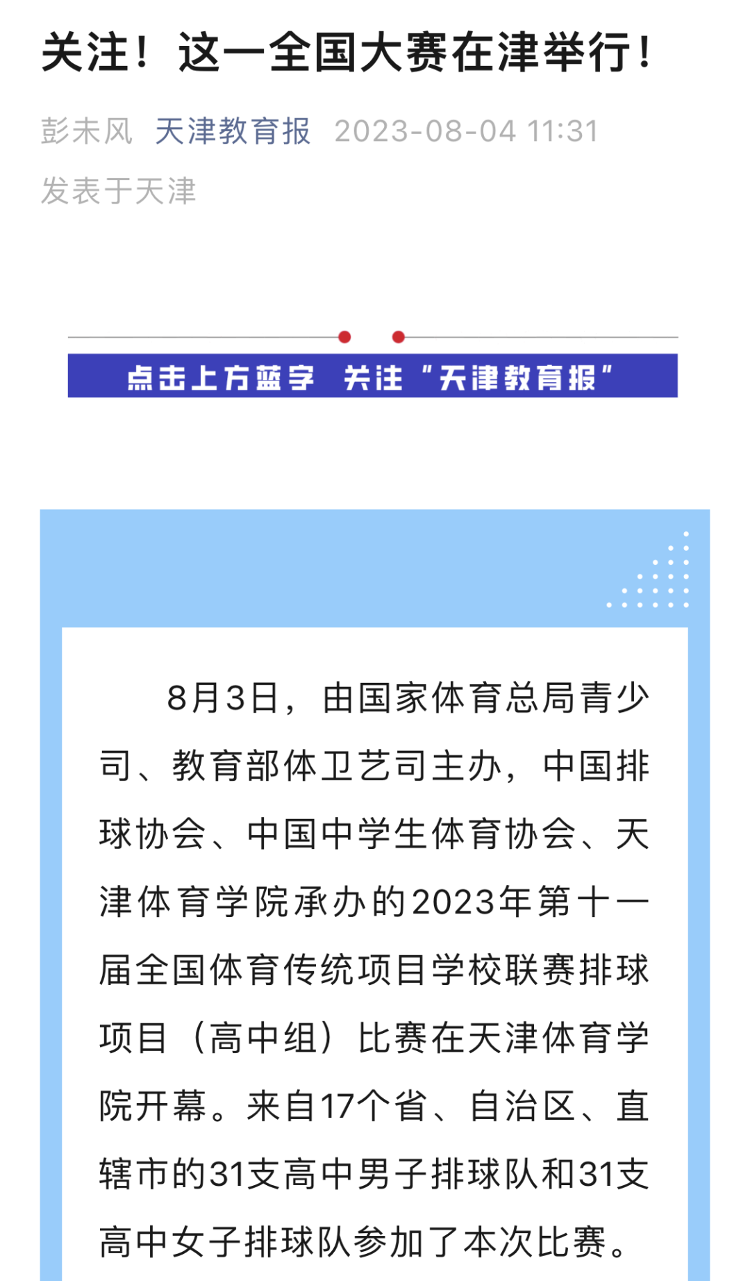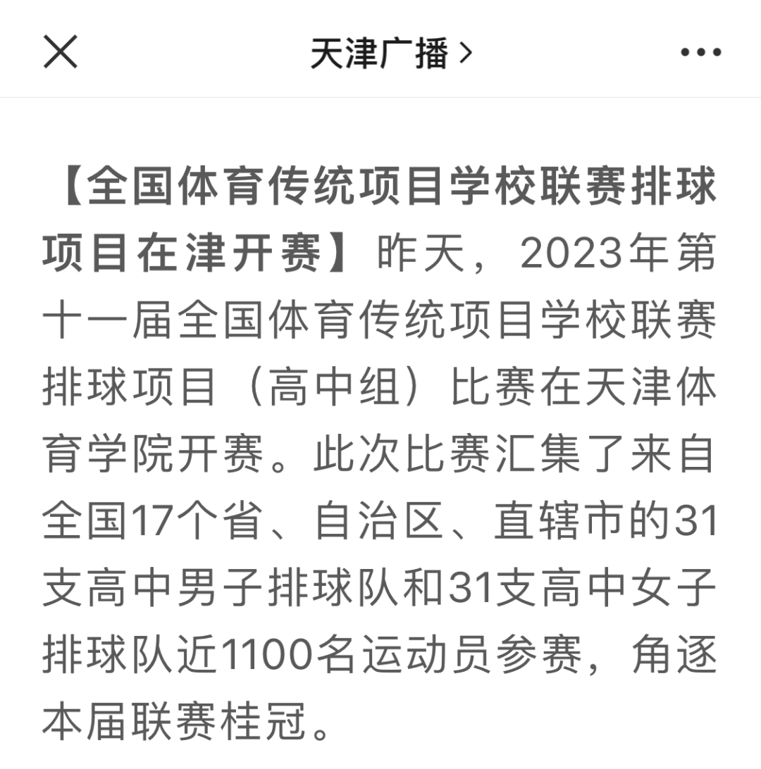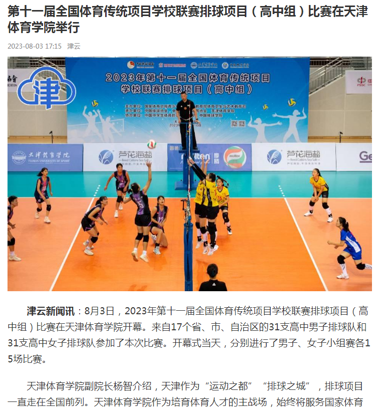开幕。来自17个省、自治区、直辖市的31支高中男子排球队和31支高中女子排球队参加了本次比赛。新华社、新华网、中国网、中国日报、光明网、《天津日报》、津云、天津广播、天津教育报新媒体、天津教育新媒体等中央和我市多家媒体对此进行了报道。