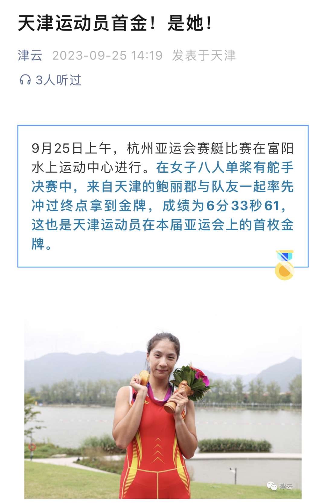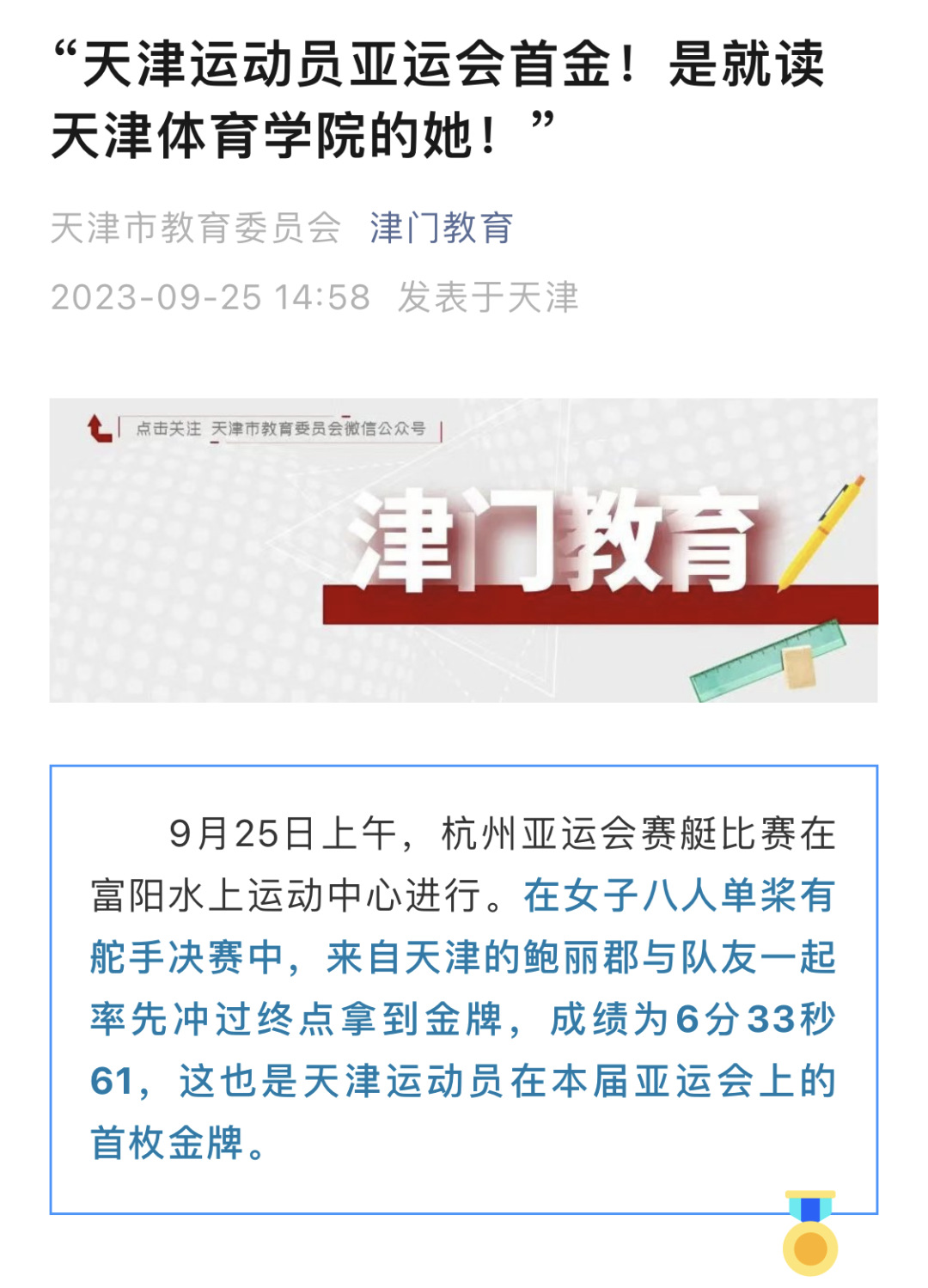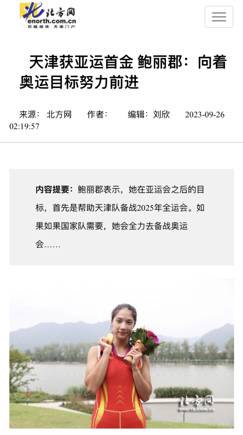 学子鲍丽郡充分发挥技战术水平,与队友协同配合、不畏强手、顽强拼搏,以绝对优势第一条艇冲过终点,摘得该项赛事金牌。这是中国体育代表团在亚运会上收获的第1500枚金牌,是天津在本届亚运会上获得的首金。央视新闻、新华社客户端、中国新闻网、《天津日报》、津云、北方网、《今晚报》、津门教育等中央和我市多家媒体对此进行了报道。