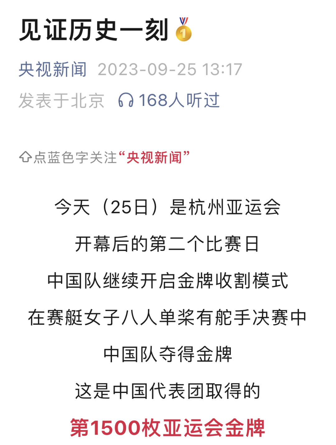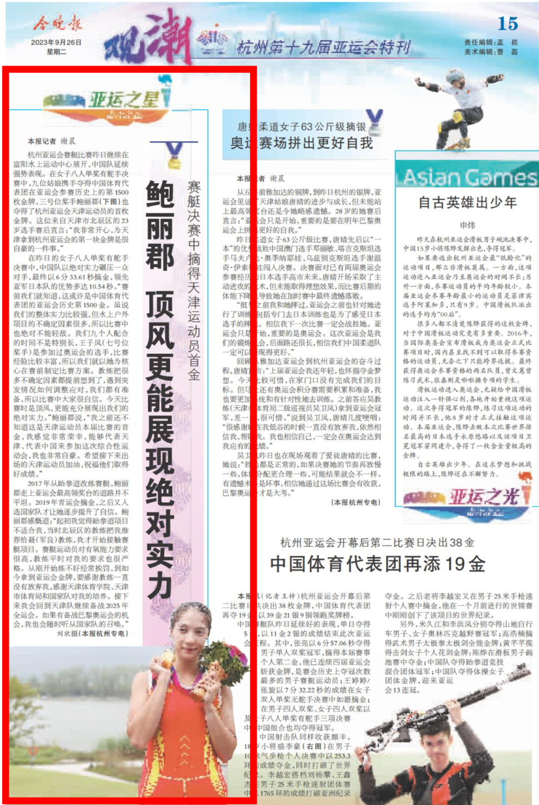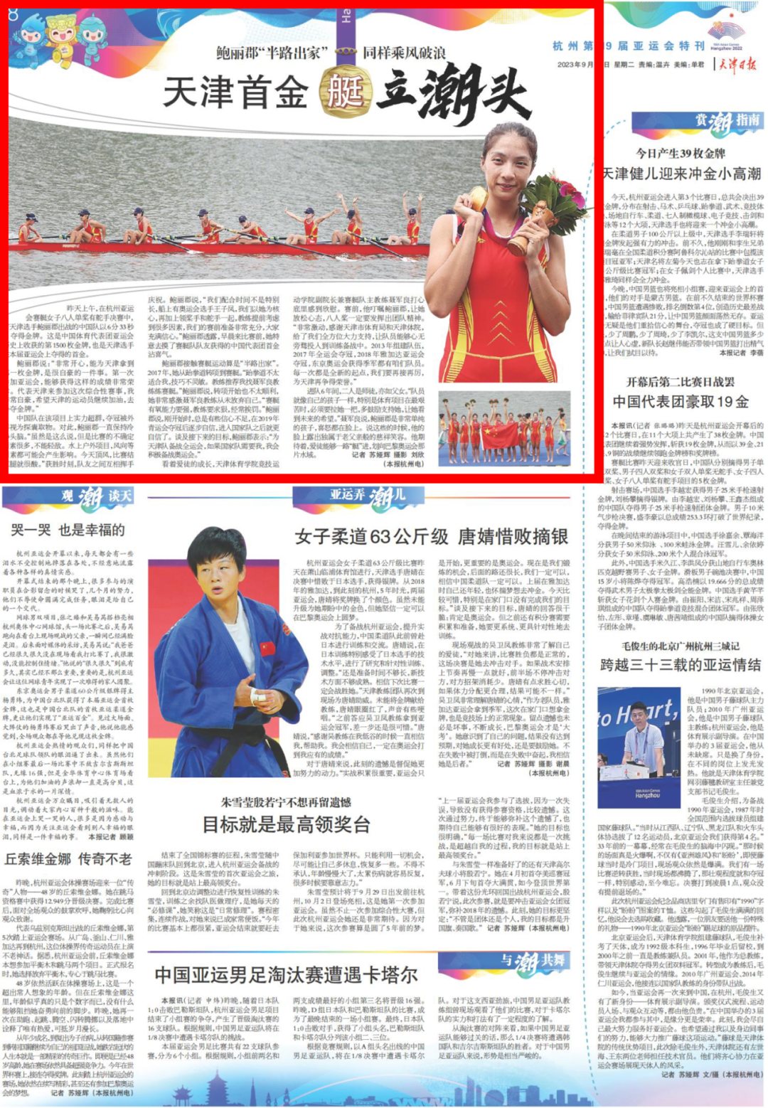 学子鲍丽郡充分发挥技战术水平,与队友协同配合、不畏强手、顽强拼搏,以绝对优势第一条艇冲过终点,摘得该项赛事金牌。这是中国体育代表团在亚运会上收获的第1500枚金牌,是天津在本届亚运会上获得的首金。央视新闻、新华社客户端、中国新闻网、《天津日报》、津云、北方网、《今晚报》、津门教育等中央和我市多家媒体对此进行了报道。