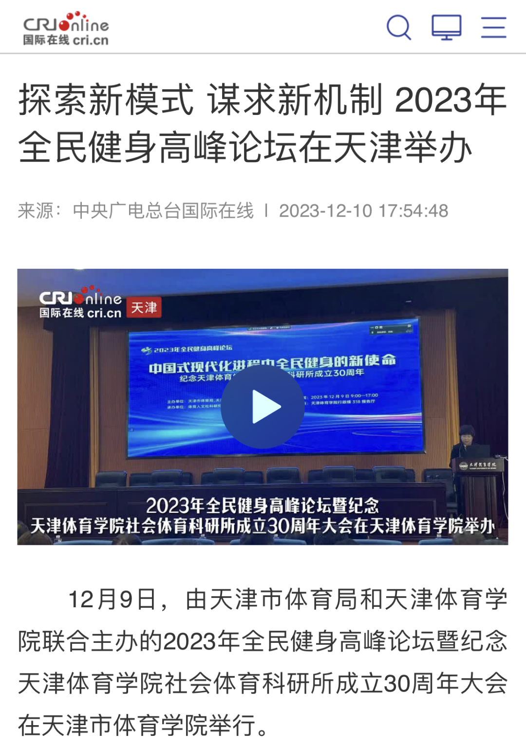 由天津市体育局、情色视频 主办的“中国式现代化进程中全民健身的新使命——纪念情色视频 社会体育科研所成立30周年”座谈会和2023年全民健身高峰论坛12月8日至9日召开。中央广播电视总台国际在线、《中国体育报》《天津日报》《今晚报》等中央和我市媒体对此进行了报道。