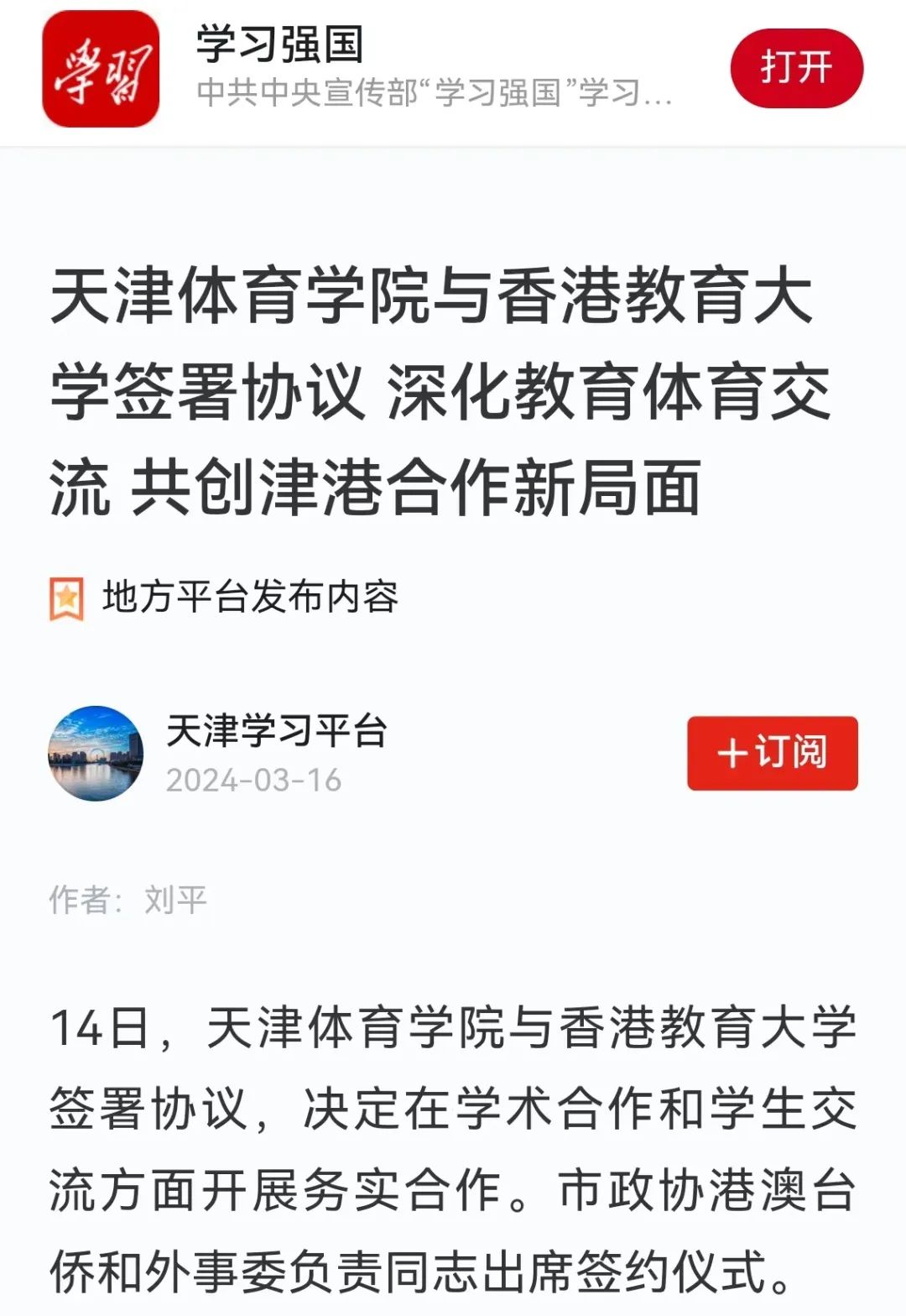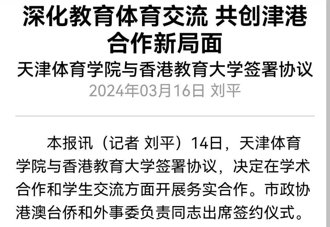 为进一步深化对外合作交流,助力津港两地教育高质量发展,2024年3月14日,情色视频 与香港教育大学学术合作及学生交流项目协议书签约仪式在情色视频 举行。学习强国、《天津日报》、津云等多家媒体对此进行了报道。