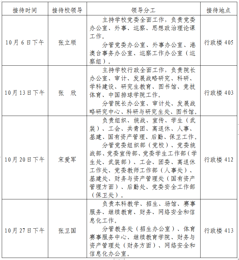 根据《情色视频 领导干部接待日制度》规定及学校近期工作安排,现将2022年10月校领导接待师生来访安排通知如下。