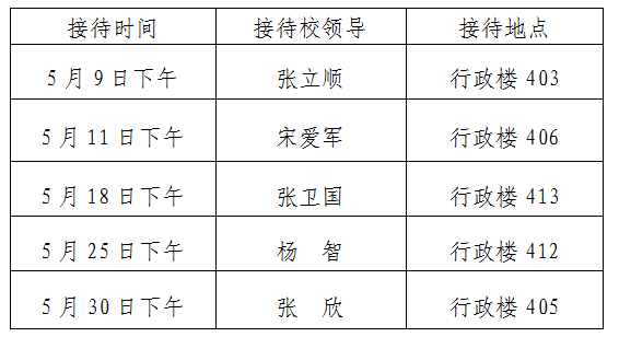 根据《情色视频 领导干部接待日制度》规定及学校近期工作安排,现将2023年5月校领导接待师生来访安排通知如下: