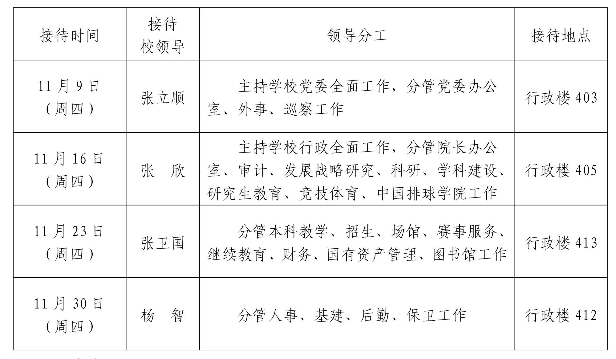根据《情色视频 领导干部接待日制度》规定及学校近期工作安排,现将2023年11月校领导接待师生来访安排通知如下: