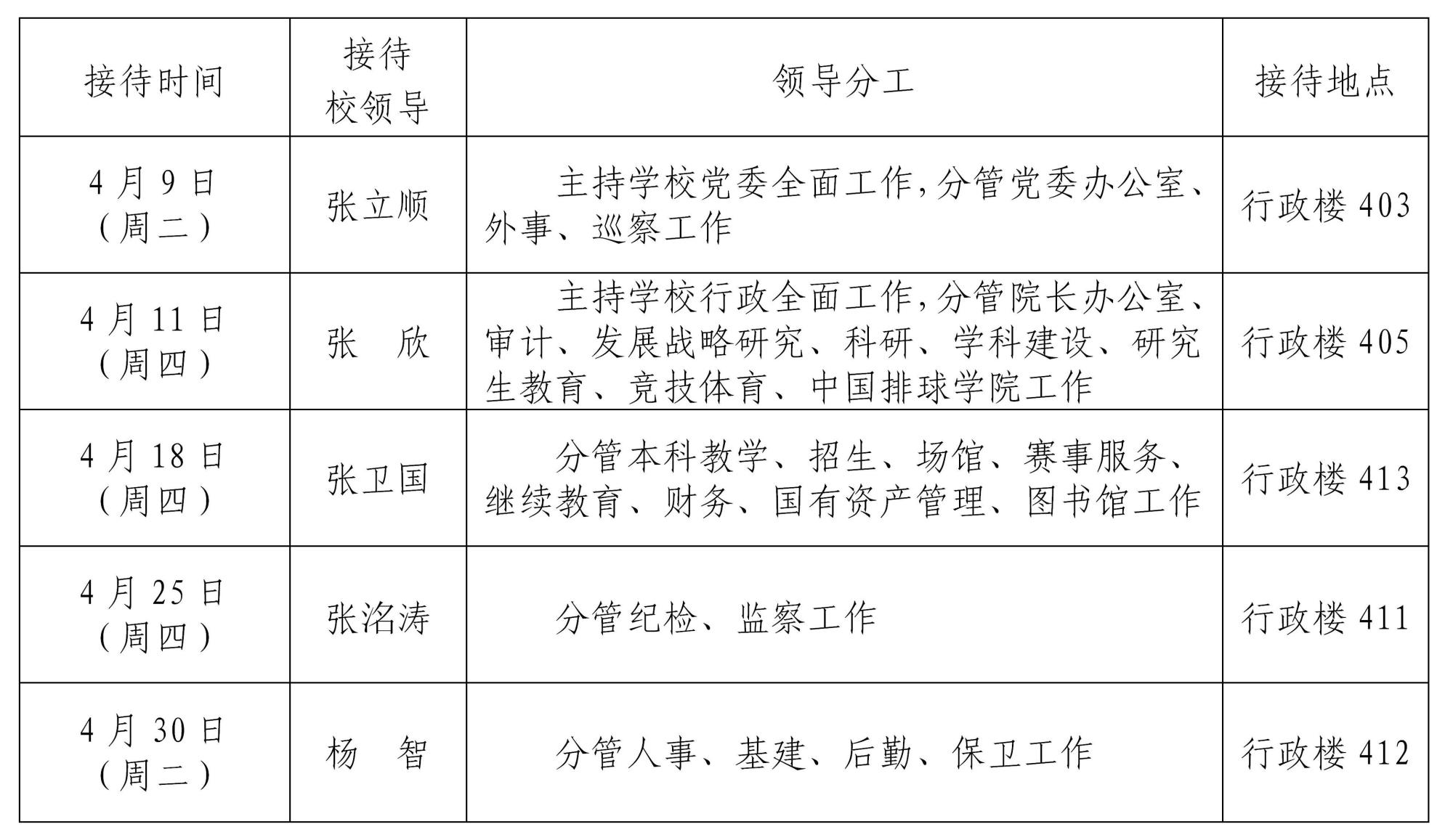 根据《情色视频 领导干部接待日制度》规定及学校近期工作安排,现将2024年4月校领导接待师生来访安排通知如下: