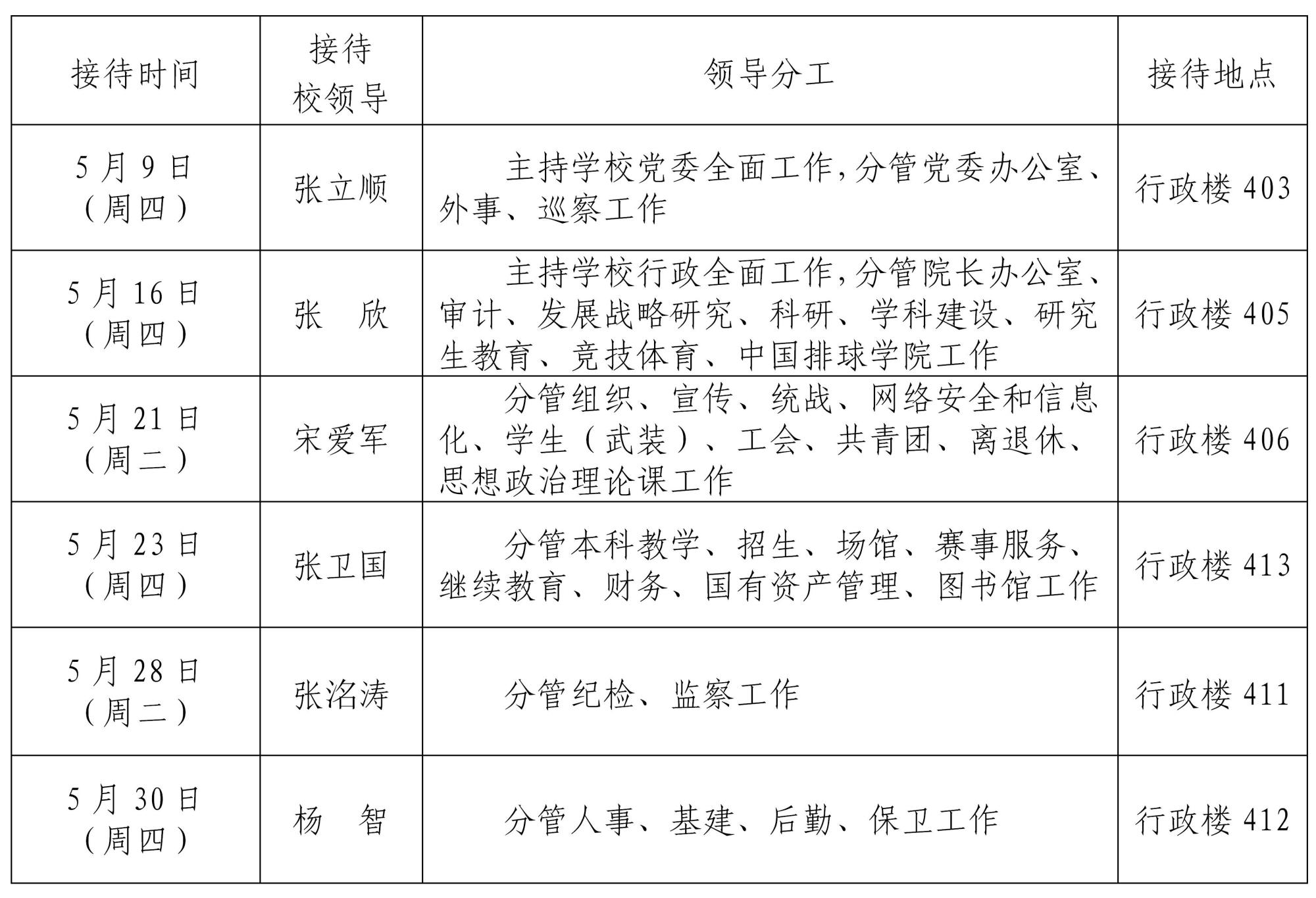 根据《情色视频 领导干部接待日制度》规定及学校近期工作安排,现将2024年5月校领导接待师生来访安排通知如下: