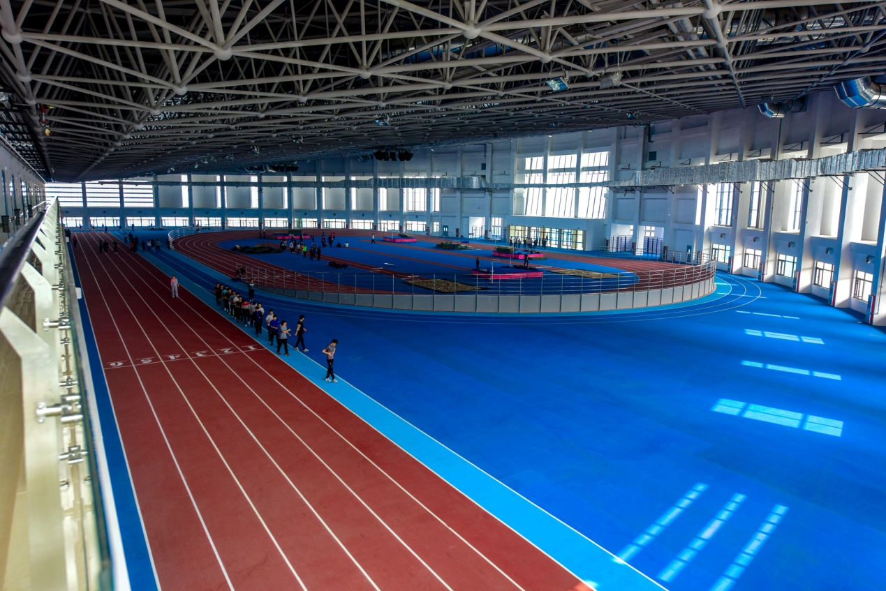 田径馆建筑面积1251平方米,场地面积864平方米,室内标准200米跑道,田径教学、训练设施设备齐全,功能完备,可承接各类比赛活动